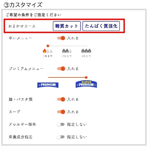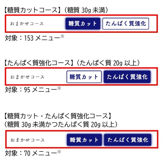 選択した場合、糖質カット・たんぱく質強化が簡単に選択できる