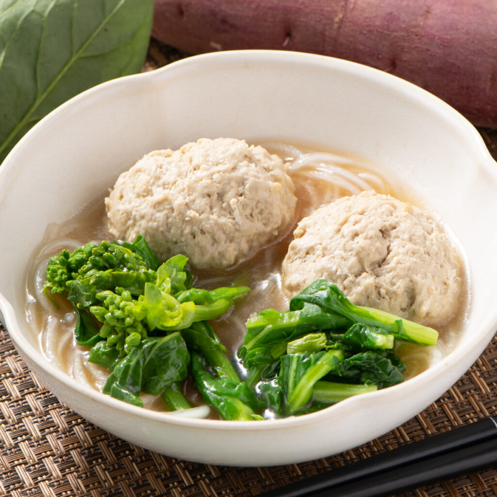 ごぼうを加えた大きめの鶏肉団子2個とのど越しのよい春雨とともに、
