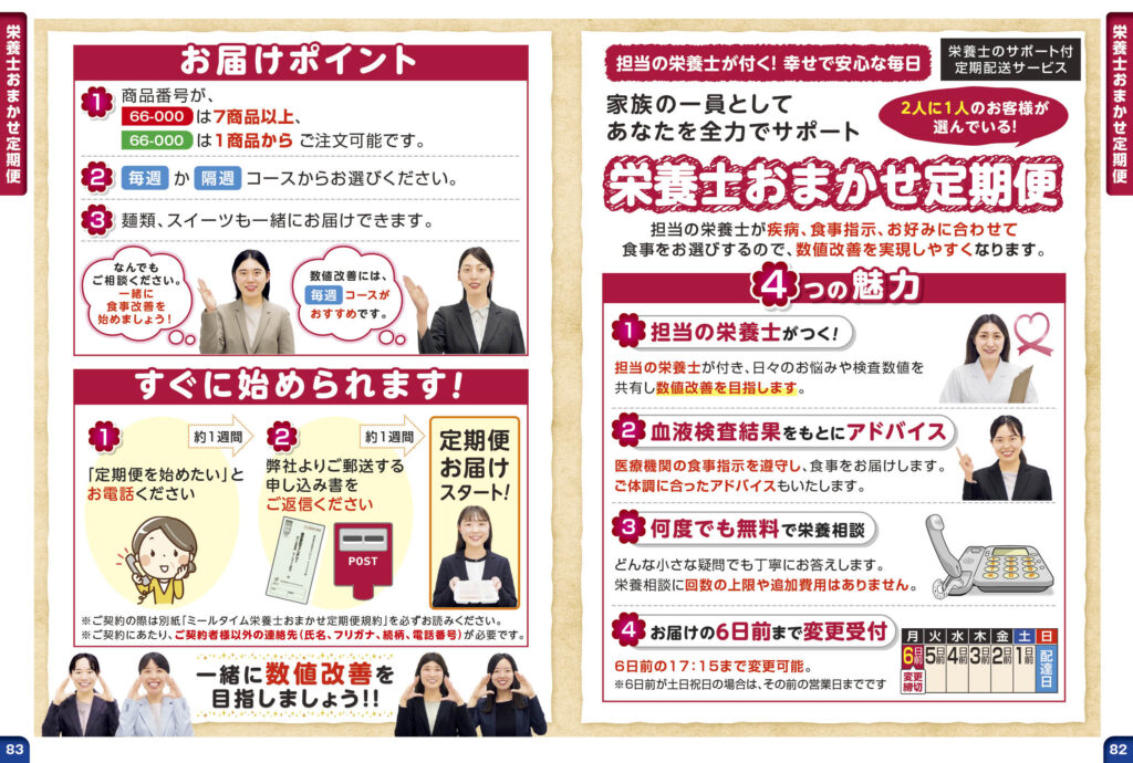 担当栄養士が一人つき、「毎週」か「隔週」のペースでお届けし、