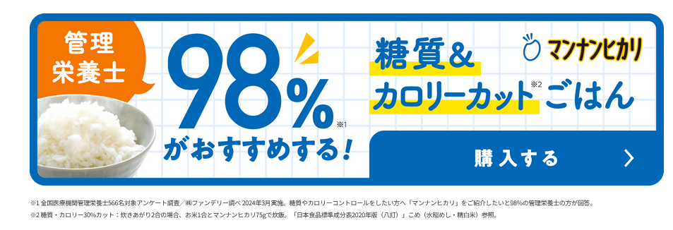 98%の管理栄養士が、糖質やカロリーコントロールをしたい方へ「マンナンヒカリ」を紹介したいと回答しております。