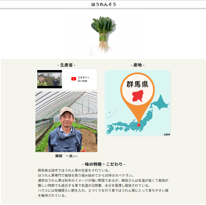 ↓ 各商品ページから食材を選択すると、生産者の情報やこだわりが見られます。