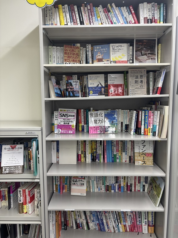 弊社にはちょっとした本棚スペースがあり、スタッフが自由に本を読めるようになっています。ジャンルもいろいろあり、自己啓発や栄養学に関するもの、小説もあります。わざわざ本屋に足を運ばなくとも、気軽に本に触れられるのはとてもありがたいです。