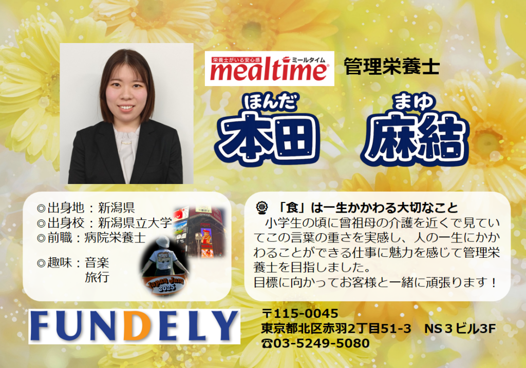 この度3月より中途採用で入職いたしました管理栄養士の本田麻結と申します。