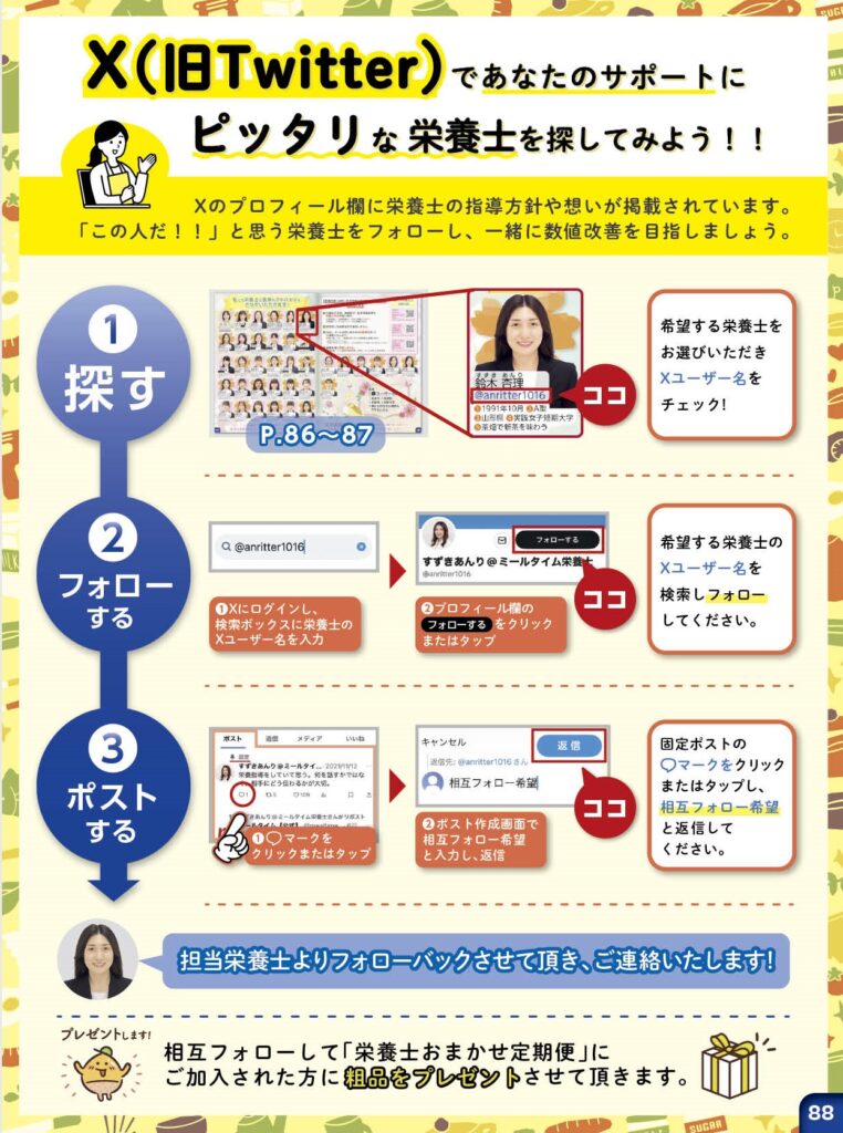 カタログ(春号 86~87ページ)に掲載されているXユーザー名をチェックし、希望の栄養士を選んでください。