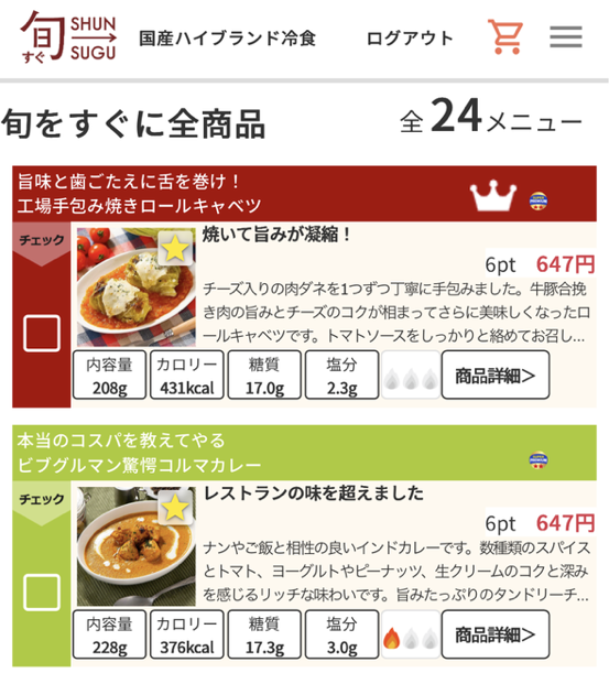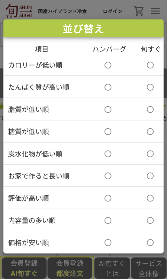 例えば、「カロリーが気になる」という方や「たんぱく質が多い商品を注文したい」という方はここから並び替えることができます。