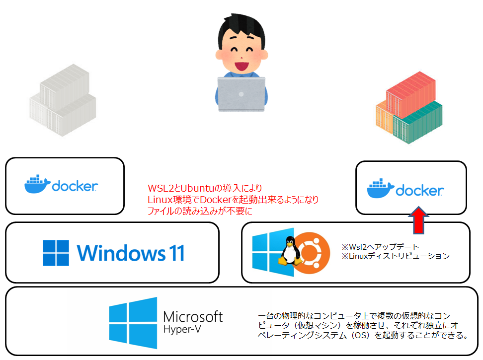 ここで重要になるのがWSL2の存在です。WSL2へのアップデートにより、Windows上でLinuxを動かすことが可能になります。つまり、Windowsにインストールされているソフトウエアの1つのようにLinuxを使用できます。これにより、仮想化でLinux上でDockerを起動させることにより、変換処理がなくなり読み込みが速くなります。