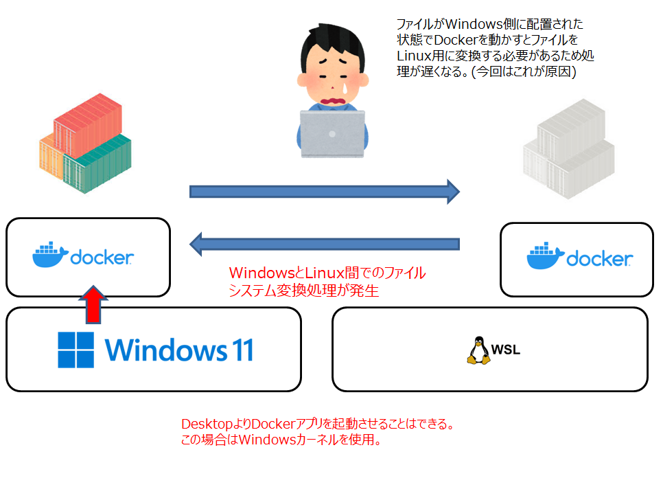Windows上にはWSL(Windows上で動作するLinuxの実行環境のこと)が備わっているため、動作はします。しかし、このWSLはLinuxではなく、LXCoreというサブシステムがLinuxの実行環境を作っています。この状態でDockerを動かすと、WindowsとLinuxではファイルシステム(ファイルの保存形式のようなもの)が異なるため、すべてのファイルをLinux用に変換する必要があり、その結果処理が遅くなります。ファイル数が少ない場合はそこまで影響はありませんが、ファイル数が多い場合はこの処理に時間がかかることで開発に大きな影響を及ぼします。