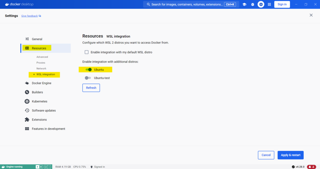 続いて、Settings/Resources/WSL integrationのUbuntuのトグルをONにする