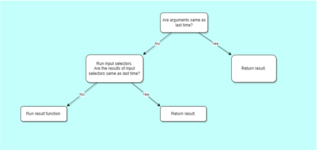 ただし、reselectのメモ化 Cascading Memoization だと、①与えられた引数が前回と同じ値かどうか比較する ②入力セレクタ(input selectors)を実行し、現在の結果を以前の結果と比較する